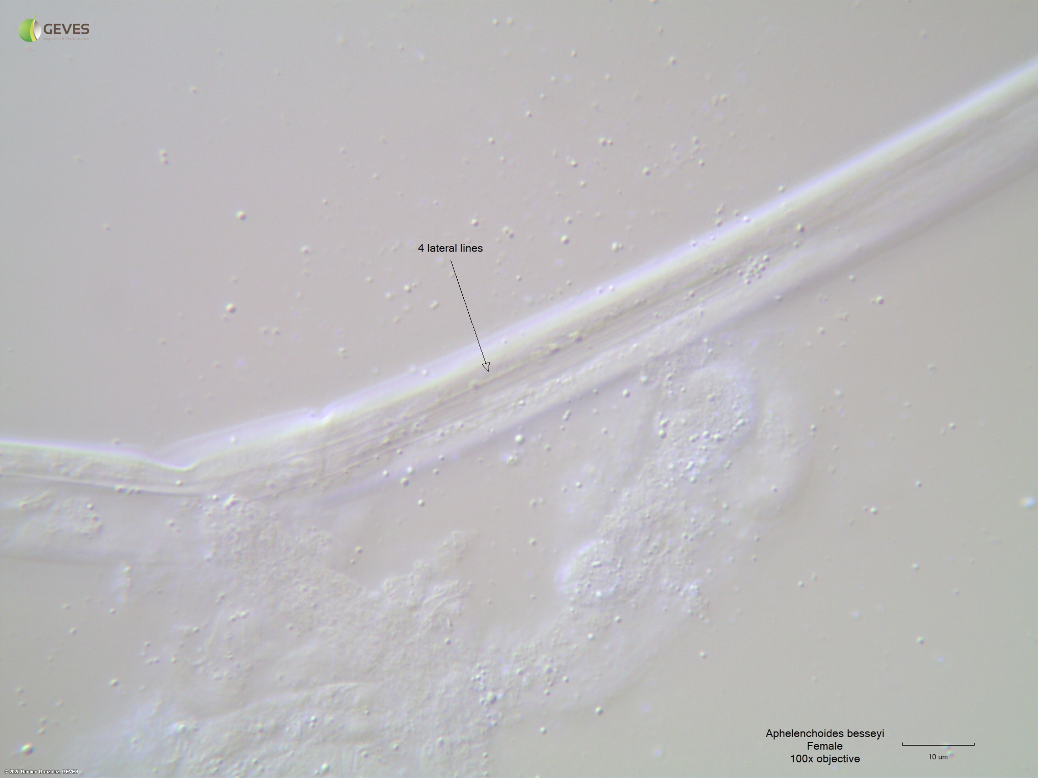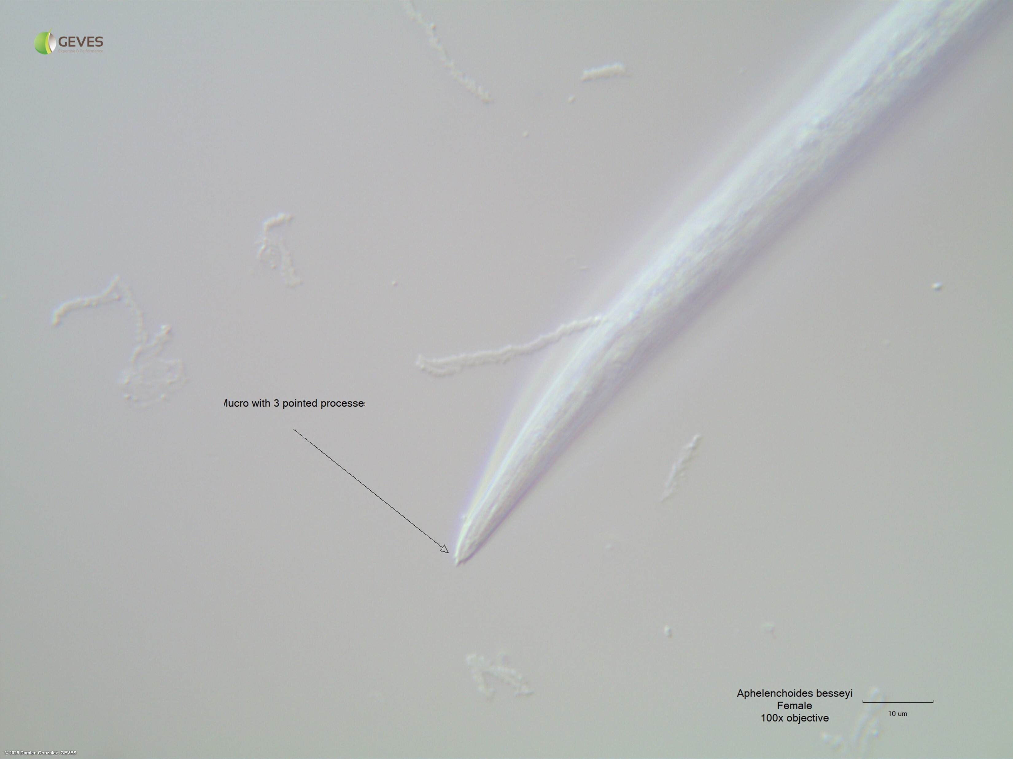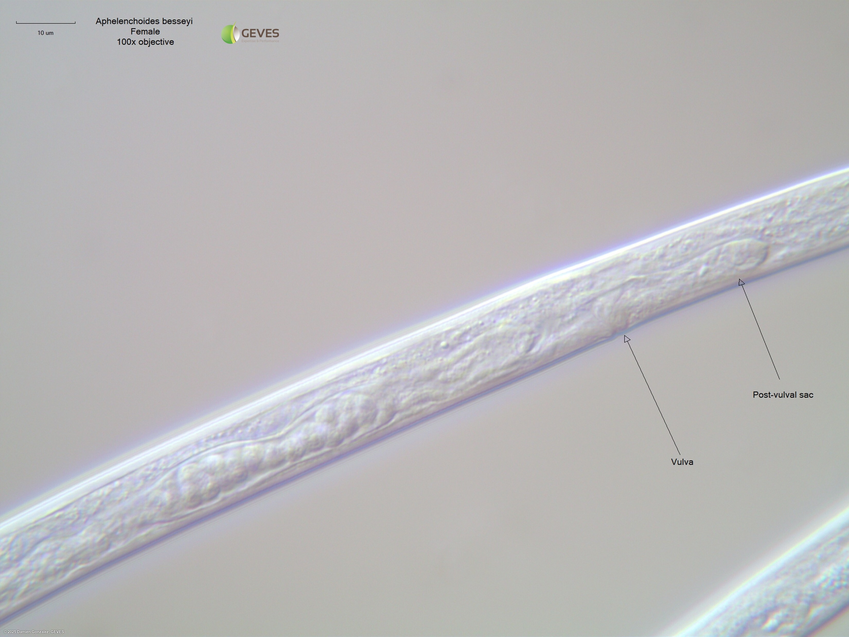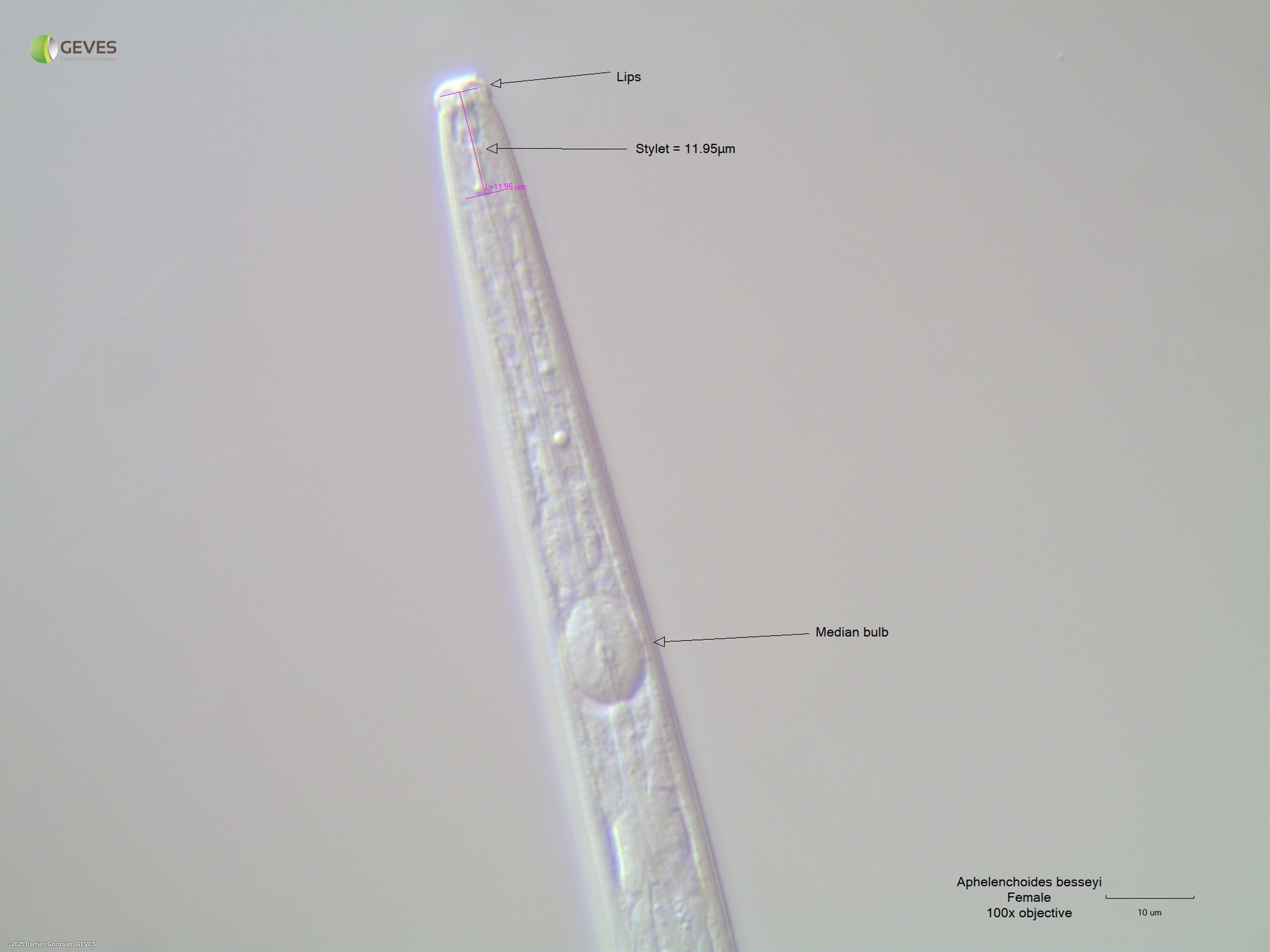 The general criteria and observations are indicated directly on the photos. Here is a comprehensive list of the main characteristics for Aphelenchoides besseyi: - Length in mm: 0.57-0.84 (female) - Head shape: Slightly « offset » and lips prominent wider than the body - Stylet length in µm: 10-12.5 - Median bulb oval - Nerve ring behind the muscular median bulb - Excretory pore near anterior edge of the nerve ring - Length of the post-vulval sac in female: 1/3 or less of the distance between the vulva and the anus - Position of the vulva relative to the anterior end, expressed as a % of the body length in female: 68.7-73.6 - Number of lateral lines: 4 - Shape of tail: conoid - Shape of mucro: 3 to 4 pointed processes