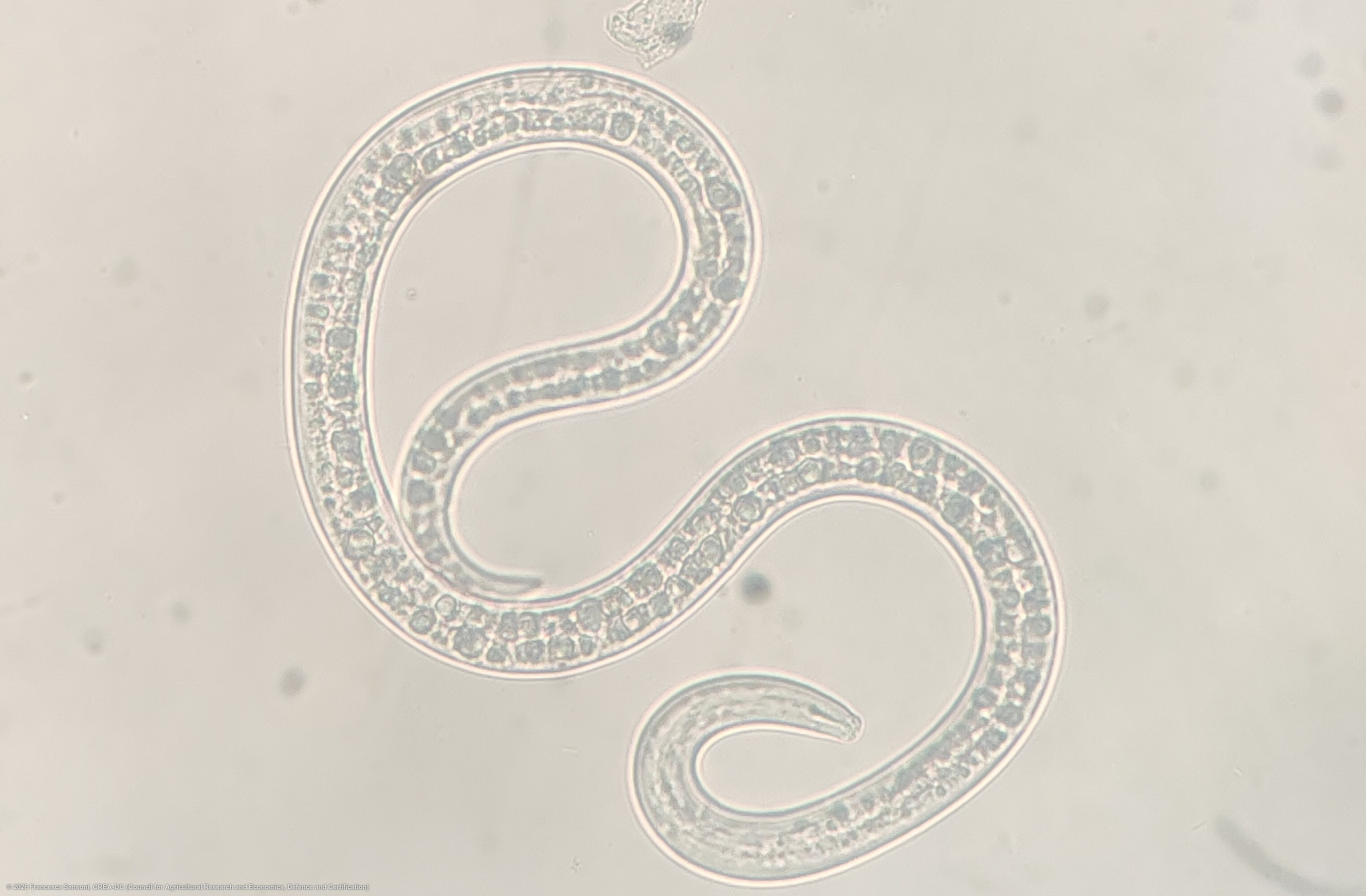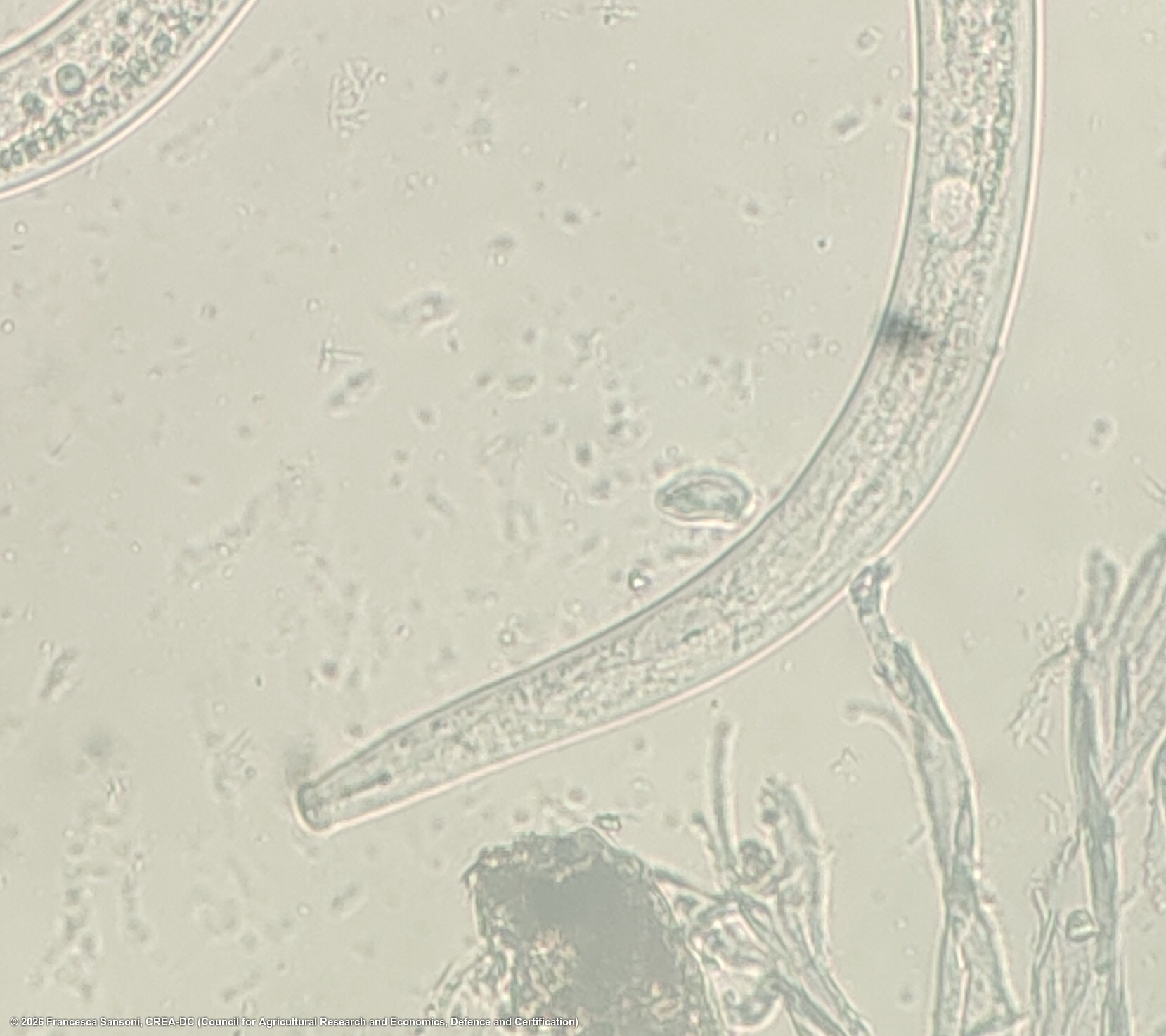 Aphelenchoides besseyi extracted from rice seeds after 24 h of water imbibition. The animal is female, the mouth apparatus is well defined, the stylet is visible as the knob. The animal was still alive when the picture was taken and it was moving.