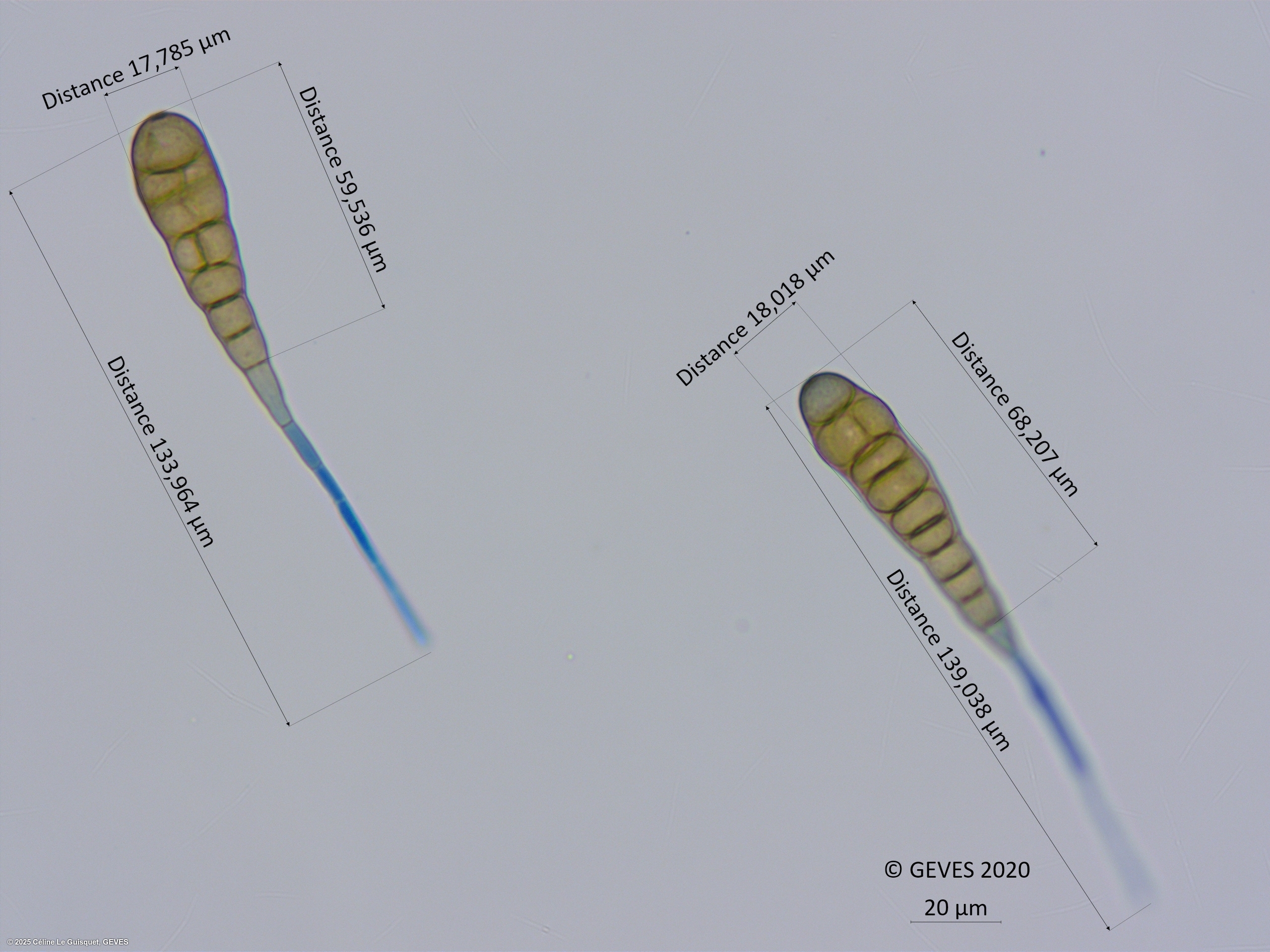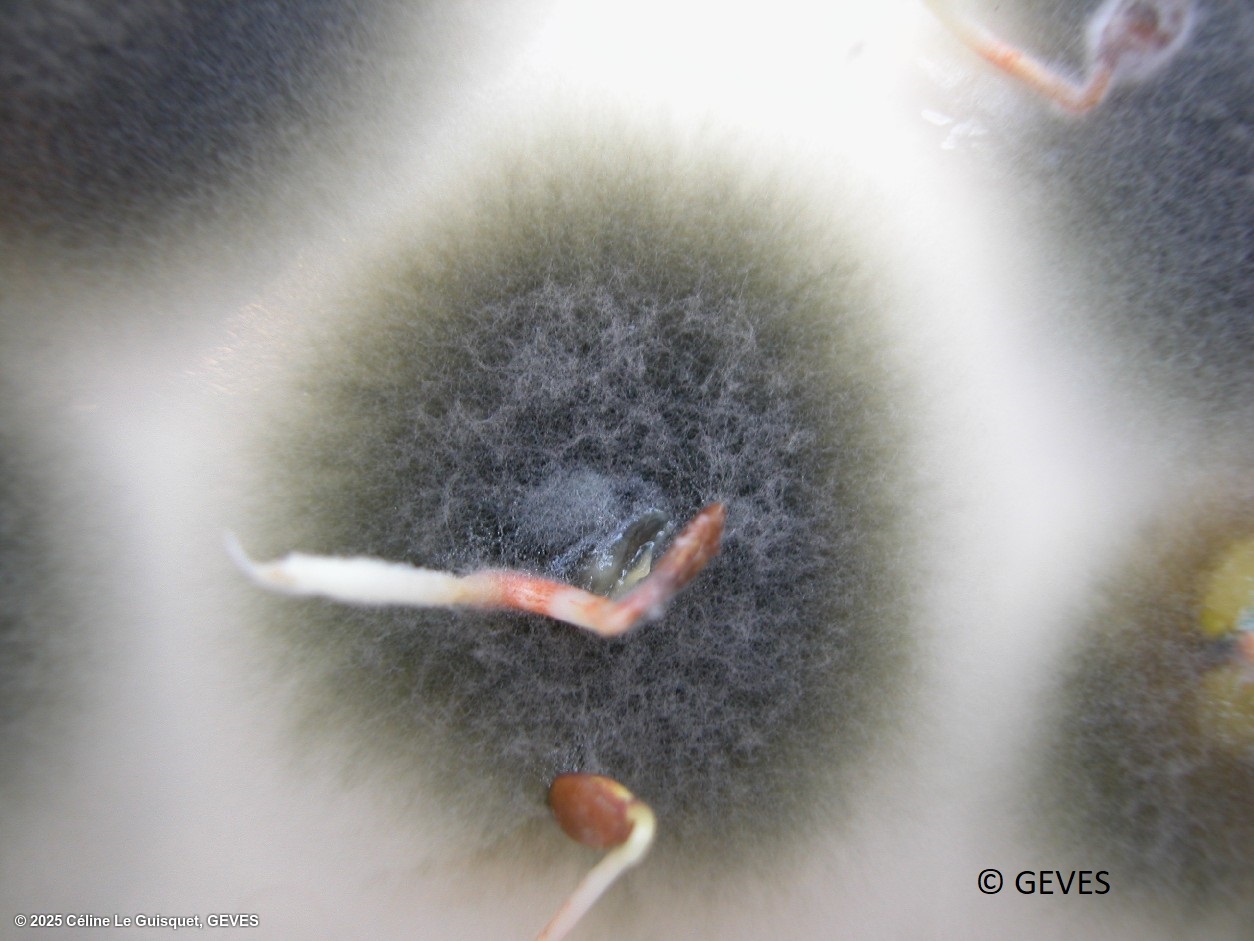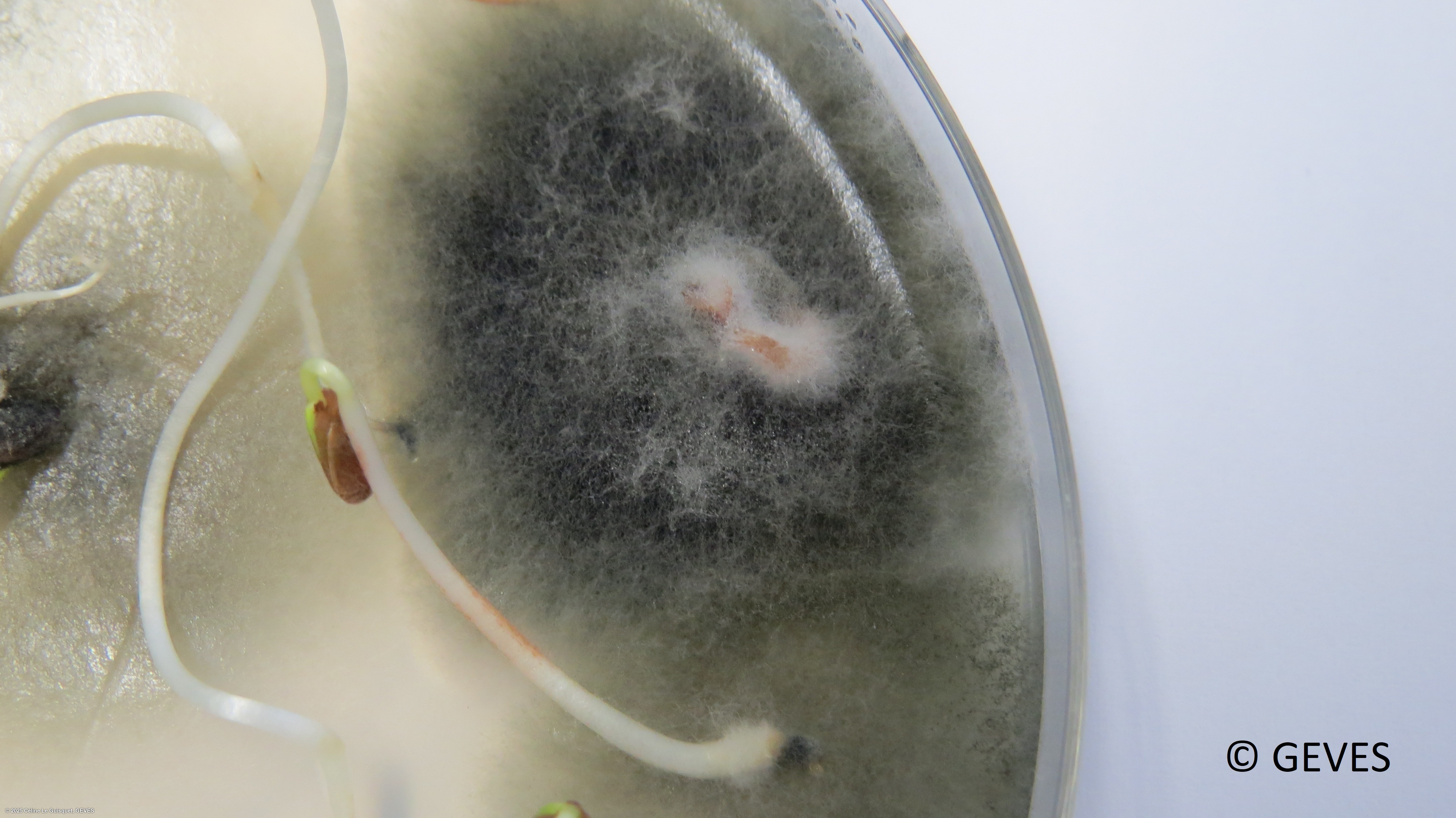 ISTA method 7-017, on malt agar. After 9 days of growth in appropriate chamber, examine plates for dense olive-grey colonies, 1.5-3cm in diamter. Some colonies of saprophytic Alternaria spp. can resemble those of A. linicola, but the conidia of A. linicola are diagnostic. Colonies should therefore be examined under x50-100 magnification. Conidiophores are simple, occuring singly or in bundles, unbranched, erect, often geniculate, with 1-2 or more scars, pale olive-brown and septate. Conidia form singly, are smooth walled, olive-brown, elongated conical to ellipsoid or obclavate, gradually tapering towards the beak. The beak is long, occasionally branched, muriform 4-16 μm with transverse septa and occasionally 1-4 longitudinal septa, sometimes slightly constricted at the septa, 16-230 x 3-4.5 μm (Corlett & Corlett, 1999; David, 1991; Malone & Muskett, 1997). The size of conidia (body and beak) is given as an indication but should not be a compulsory idnetification criteria. Size of conidia depends on the growth media, isolate, growth conditions; depending on refernces they have been described as (13-) 15-18 (-22.5) x (3-) 3.5-4 (-4.5) μm (Damm et al, 2014), or 20-130 x (7-) 17-24 (-30) μm (anonymous, 1991). Short red streak and water soaked areas may be visible on the hypocotyls and cotyledons of some infected seedlings.