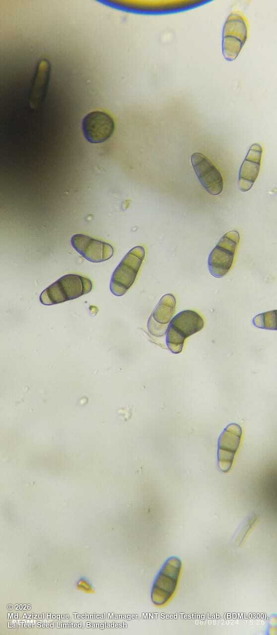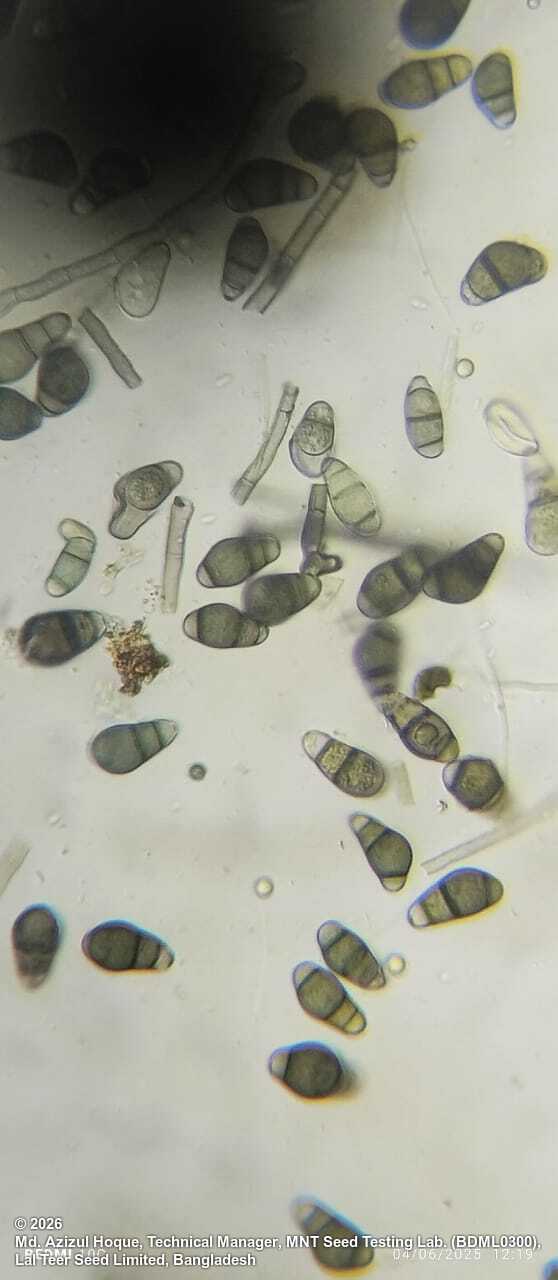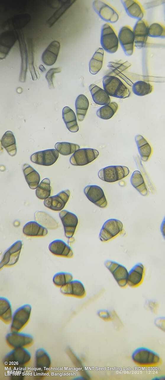 Growth of the fungus variable. It may consist of a few isolated, dark conidiophores, short to long, bearing clusters of black, shiny conidia at the tips. The growth may be extensive, covering part of seed or whole seed. The conidiophores can also be in small groups (3-4) or in some cases many conidiophores may arise from one point as a compact tuft when only few conidiophores bear 1-2 conidia. The arrangment of conidia on conidiophores is acropleurogenous showing variation: verticils, loose spike, spike.
