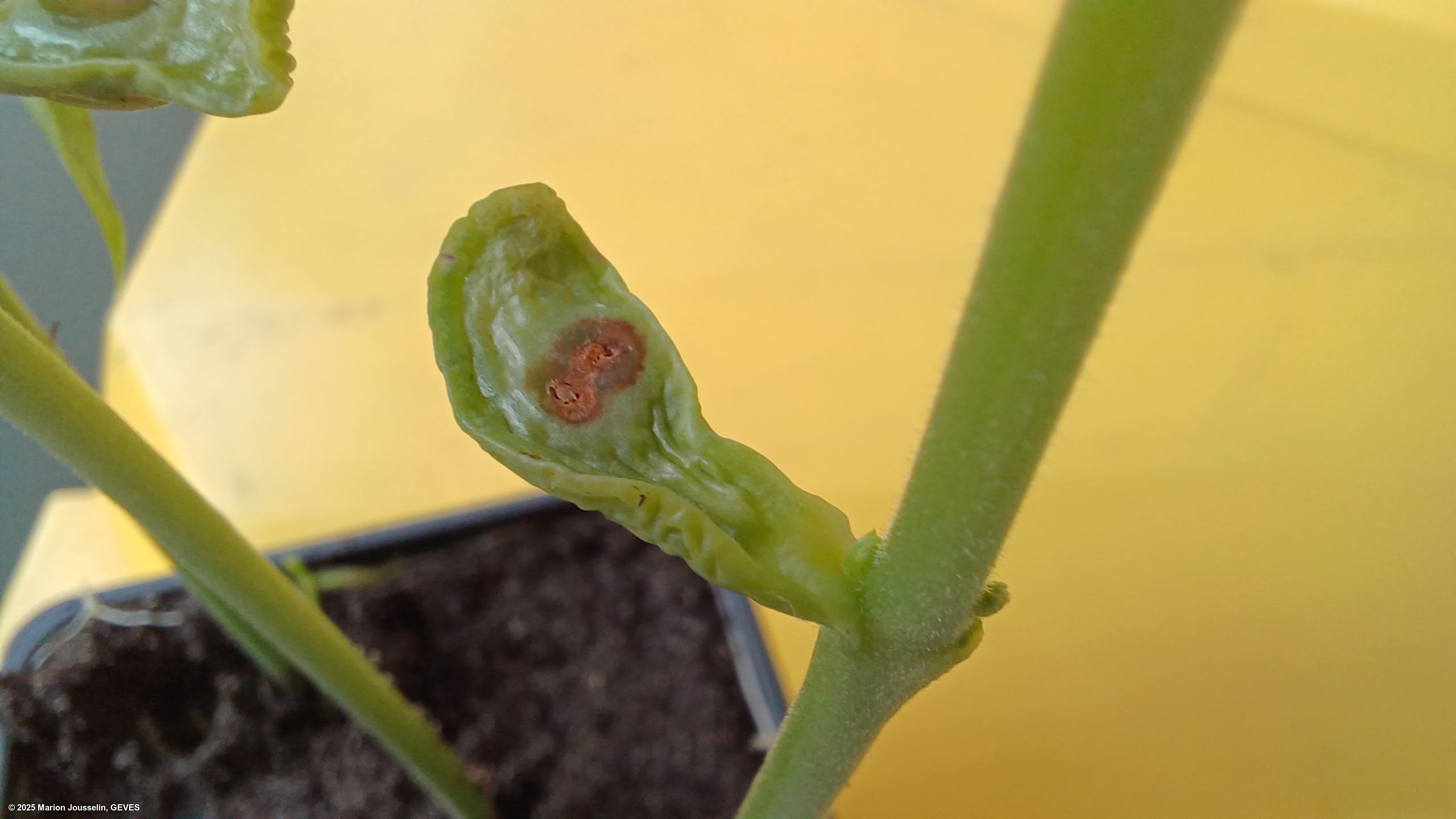 Pathogenicity tests should be carried out on a bean cultivar known to be susceptible to all races of Psp (e.g. cv. Helda). Innoculation can be done on the cotyledon, and seedlings should be transferred to damp soil for an additional 4-5 days at 20-25C with alternating light and dark cycles (12:12). Symptoms after 4-5 days should present as typical 'greasy' spots at the point of innoculation (flat inner sides). Reinspection may be carried out again at days 8-10, but the cotyledons may deteriorate too much.
