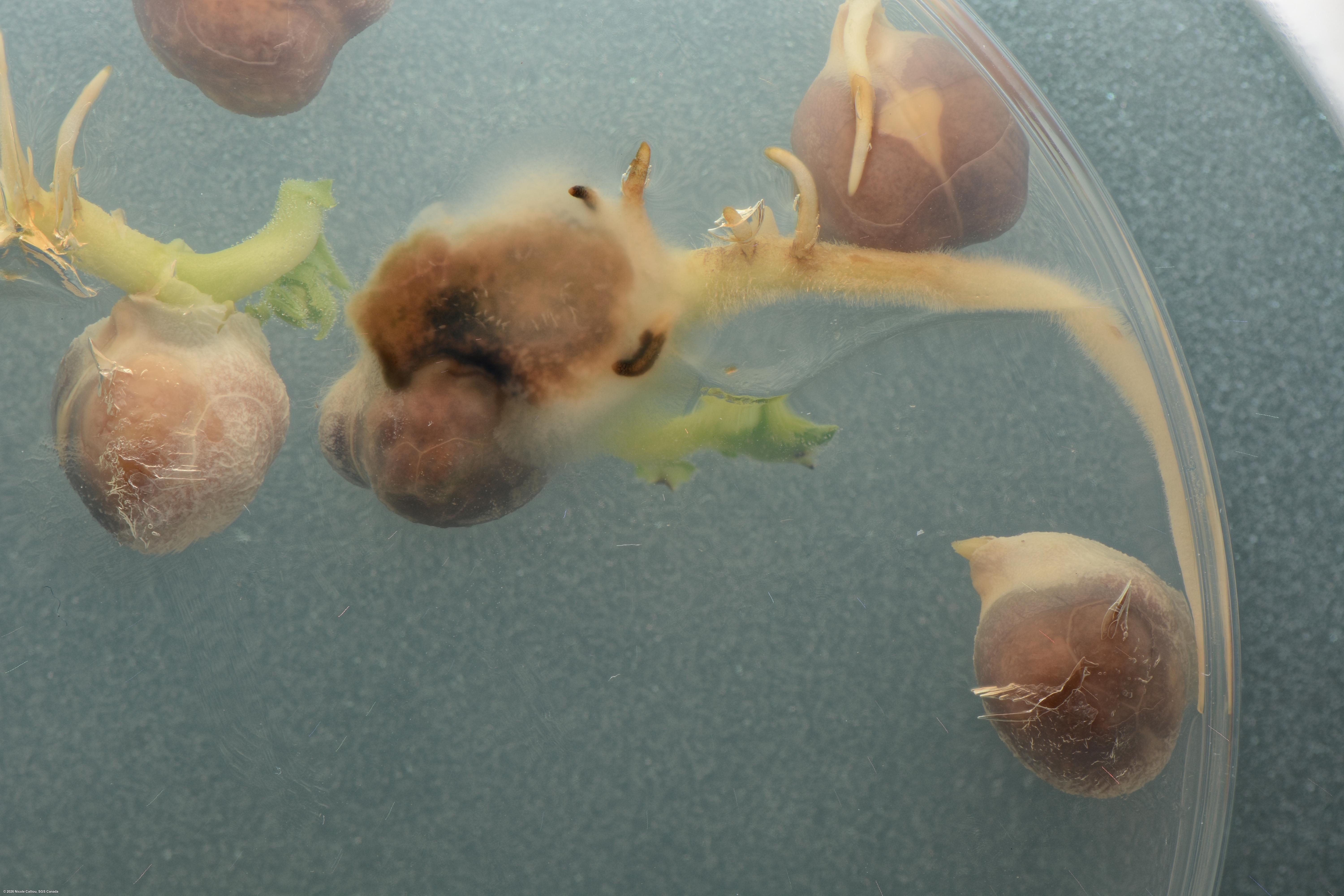 Growth on blotters: Mycelium scanty to moderate, light brown to pinkish and fluffy. Pycnidia submerged or superficial, with or without orange spore exudate. Pycnidiospores hyaline, straight or slightly curved, rounded at each end, many non-septate, some 1-septate, 6-16 x 3-7 μm.