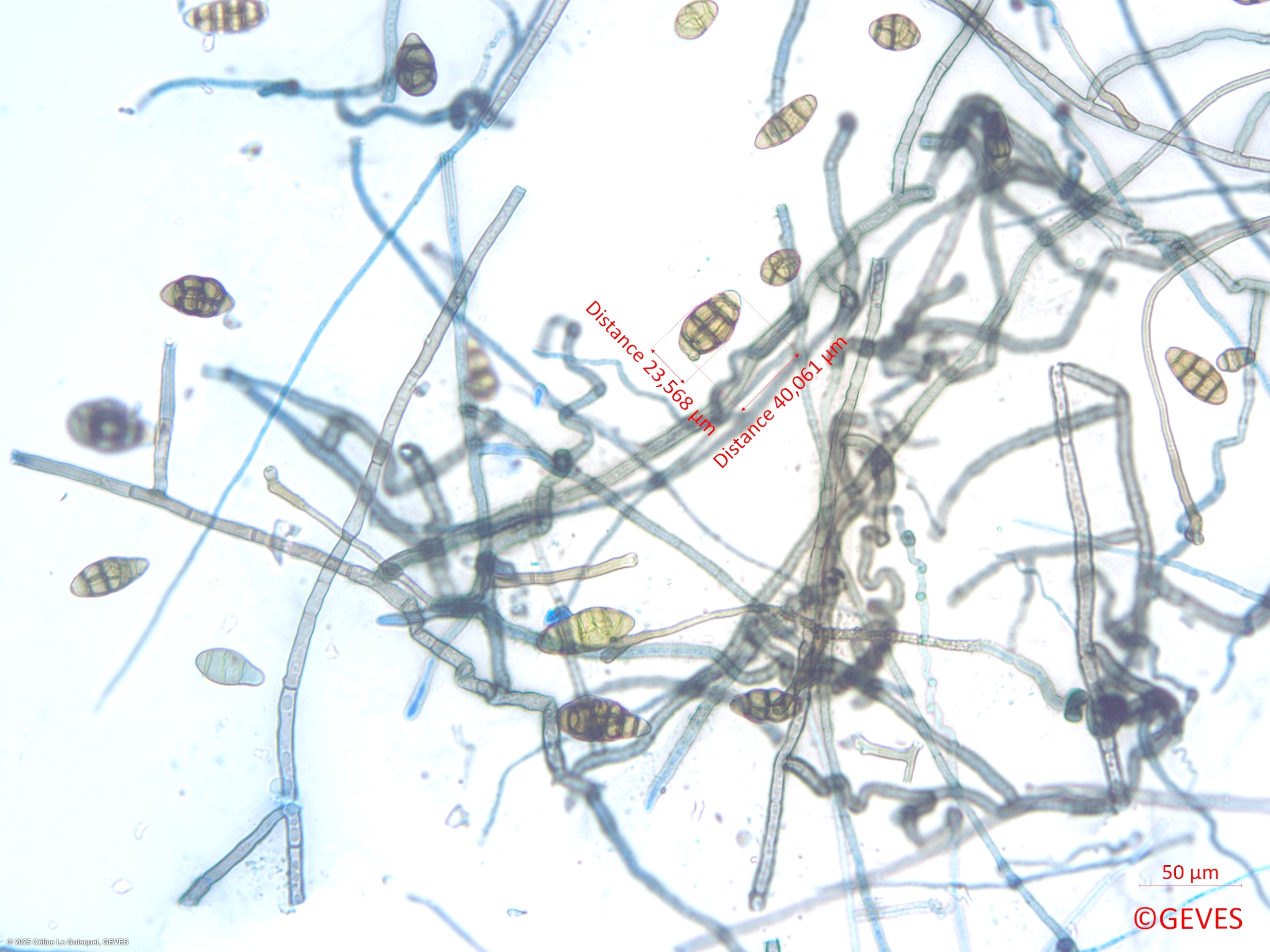 The fungus produces greyish, fluffy mycelium in which black, shiny conidia, single or in pairs, rarely in short chains, are seen on the conidiophores.